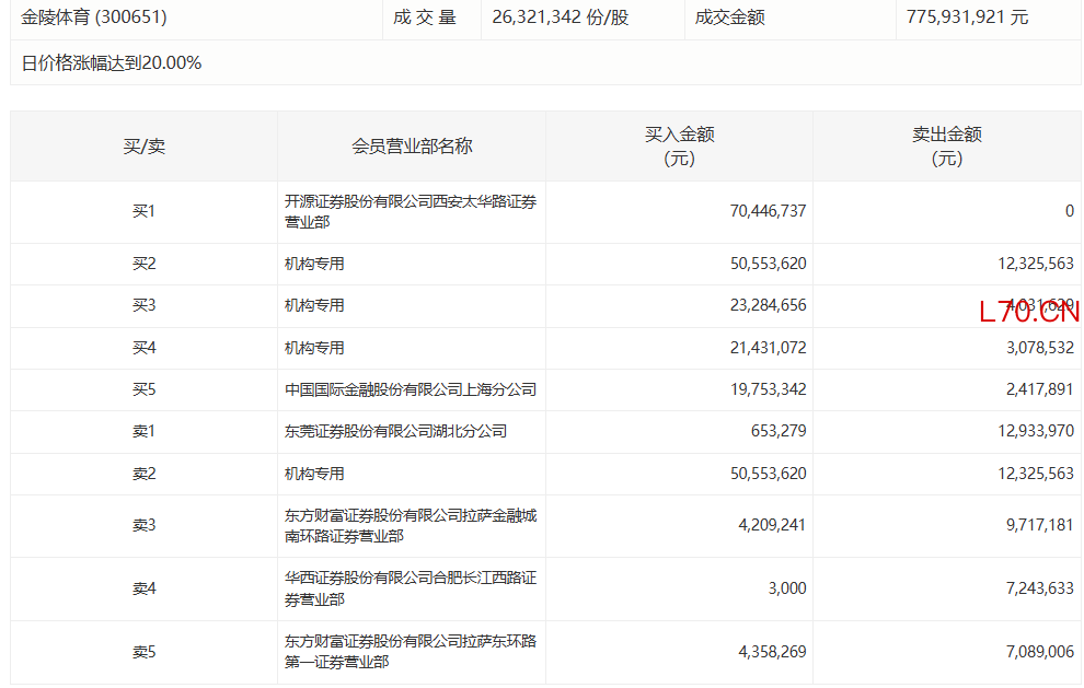 金陵体育今日涨20.00% 3家机构专用席位净买入7583.36万元