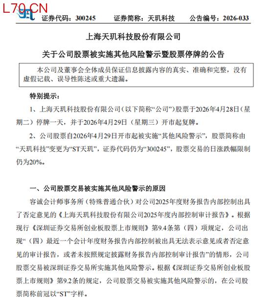 4月27日晚,天玑科技公告,因公司2025年度内部控制审计报告被出具否定意见,根据深交所相关规定,公司股票于4月28日停牌一天,4月29日开市起复牌,并被实施其他风险警示。股票简称由“天玑科技”变更为“ST天玑”,证券代码仍为300245,股票交易的日涨跌幅限制仍为20%。