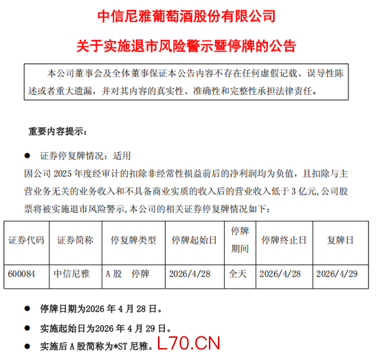 中信尼雅4月27日晚发布公告称,因公司2025年度经审计的扣非净利润等均为负值,且扣除与主营业务无关的业务收入和不具备商业实质的收入后的营业收入低于3亿元,公司股票将被实施退市风险警示,于4月28日停牌1天,4月29日起被实施退市风险警示,A股简称变更为“*ST尼雅”,股票日涨跌幅限制为5%。