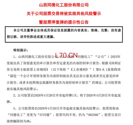 同德化工4月27日晚发布公告称,因公司2025年度被出具否定意见的内部控制审计报告,根据深交所相关规定,公司股票交易将被实施其他风险警示。公司股票自4月28日开市起停牌1天,将于4月29日开市起复牌,并实施其他风险警示。实施后,公司股票简称由“同德化工”变更为“ST同德”,股票代码不变,日涨跌幅限制为5%。