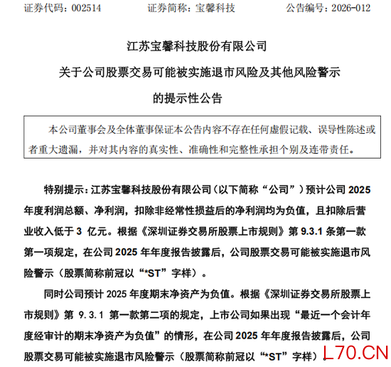 因触及财务类退市指标,公司股票在2025年年报披露后可能被实施退市风险警示(*ST)。此外,若最近三个会计年度扣非前后净利润孰低者均为负值,且审计机构出具带持续经营重大不确定性强调事项段的保留意见审计报告,公司股票将被叠加实施其他风险警示。目前年报审计工作仍在进行中,最终数据以经审计的年度报告为准。