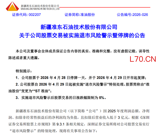 准油股份4月27日晚发布公告,因公司2025年度利润总额、净利润及扣非净利润均为负值,且扣除后营业收入低于3亿元,触及深交所退市风险警示情形。公司股票于4月28日停牌一天,自4月29日开市起复牌,并实施“退市风险警示”,股票简称由“准油股份”变更为“*ST准油”,日涨跌幅限制为5%。