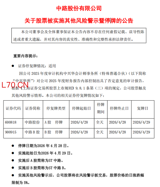 中路股份4月27日晚公告称,因公司2025年度审计机构中兴华会计师事务所对公司2025年度财务报告内部控制出具了否定意见的审计报告,根据《上海证券交易所股票上市规则》相关规定,公司股票触及其他风险警示情形。公司股票及债券将于4月28日停牌一天,4月29日起实施其他风险警示。