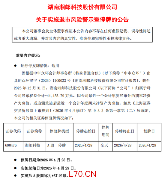 湘邮科技4月27日晚公告称,因公司2025年度经审计的期末归属于母公司股东权益为-4.45亿元,触及上交所股票上市规则规定的退市风险警示情形。公司股票于4月28日停牌一天,4月29日起实施退市风险警示,证券简称变更为“*ST湘邮”。