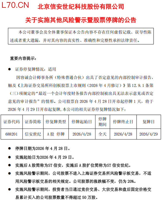 4月27日晚,信安世纪发布公告,因容诚会计师事务所出具了否定意见的内部控制审计报告,触及上交所科创板股票上市规则相关规定,公司股票自4月28日开市起停牌1天,将于4月29日开市起复牌并实施其他风险警示。