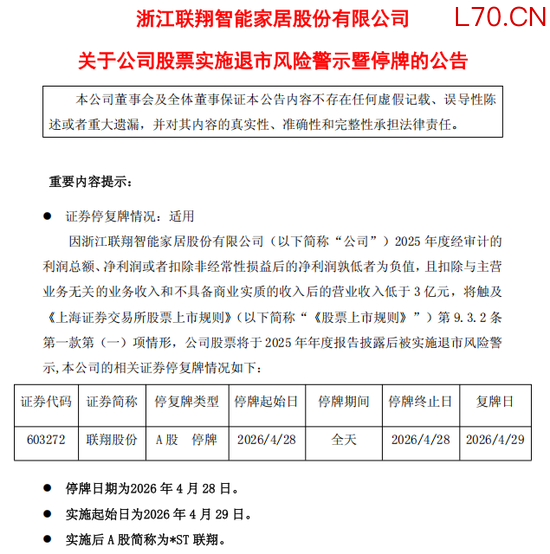 联翔股份同日晚间发布公告称,因公司2025年度经审计的净利润等指标为负值,且扣除与主营业务无关的业务收入和不具备商业实质的收入后的营业收入为1.27亿元,低于3亿元,触及退市风险警示情形。公司股票将于4月28日停牌1天,4月29日起被实施退市风险警示,A股简称变更为“*ST联翔”,日涨跌幅限制为5%。