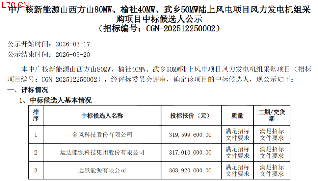 「风电之音」获悉,3月17日,中广核新能源山西方山80MW、榆社40MW、武乡50MW陆上风电项目风力发电机组采购项目中标候选人公示。