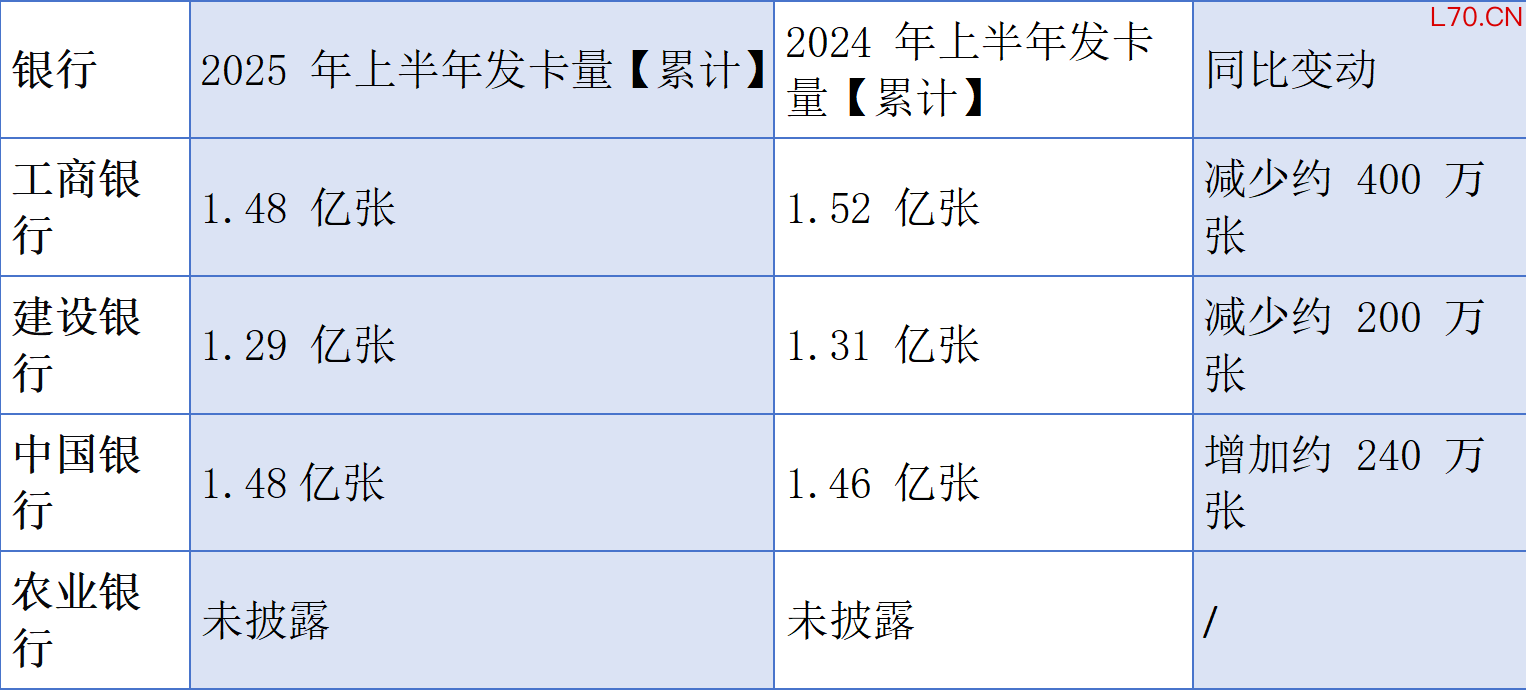 从国有大行2025年上半年财报中的累计发卡量数据与2024年同期数据对比测算中,亦可窥见此次调整的力度:除农业银行未披露具体数据外,工商银行信用卡量减少约400万张,建设银行减少约200万张,交通银行减少约479万张,邮储银行减少约100万张,唯有中国银行增加近240万张。