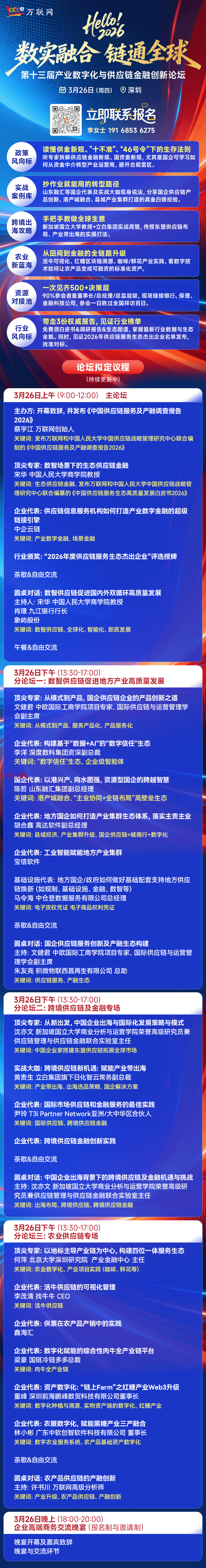 由万联网主办,并获深度数科、高达软件等合作伙伴的鼎力支持,以及中国人民大学中国供应链战略管理研究中心、万联供应链新质发展智库等单位大力支持的2026第十三届产业数字化与供应链金融创新论坛,将于3月26日在深圳盛大召开,以“数实融合·链通全球”为主题,至今已连开12届,早已成为供应链行业的风向标,直击行业转型痛点,为国企供应链转型找破局之法。