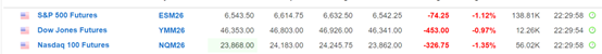与此同时,美国三大股指期货亦大幅下跌。截至发稿,道琼斯工业平均指数期货下跌0.97%;标普500指数期货下跌1.12%,纳斯达克100指数期货下跌1.35%。