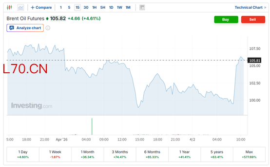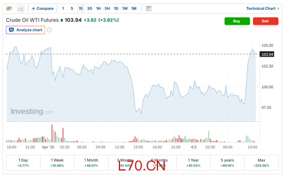 油价大幅上涨。截至目前,美国西德克萨斯中质(WTI)原油期货价格上涨3.82%,至每桶103.94美元。国际基准布伦特原油价格上涨4.61%,至每桶105.82美元。